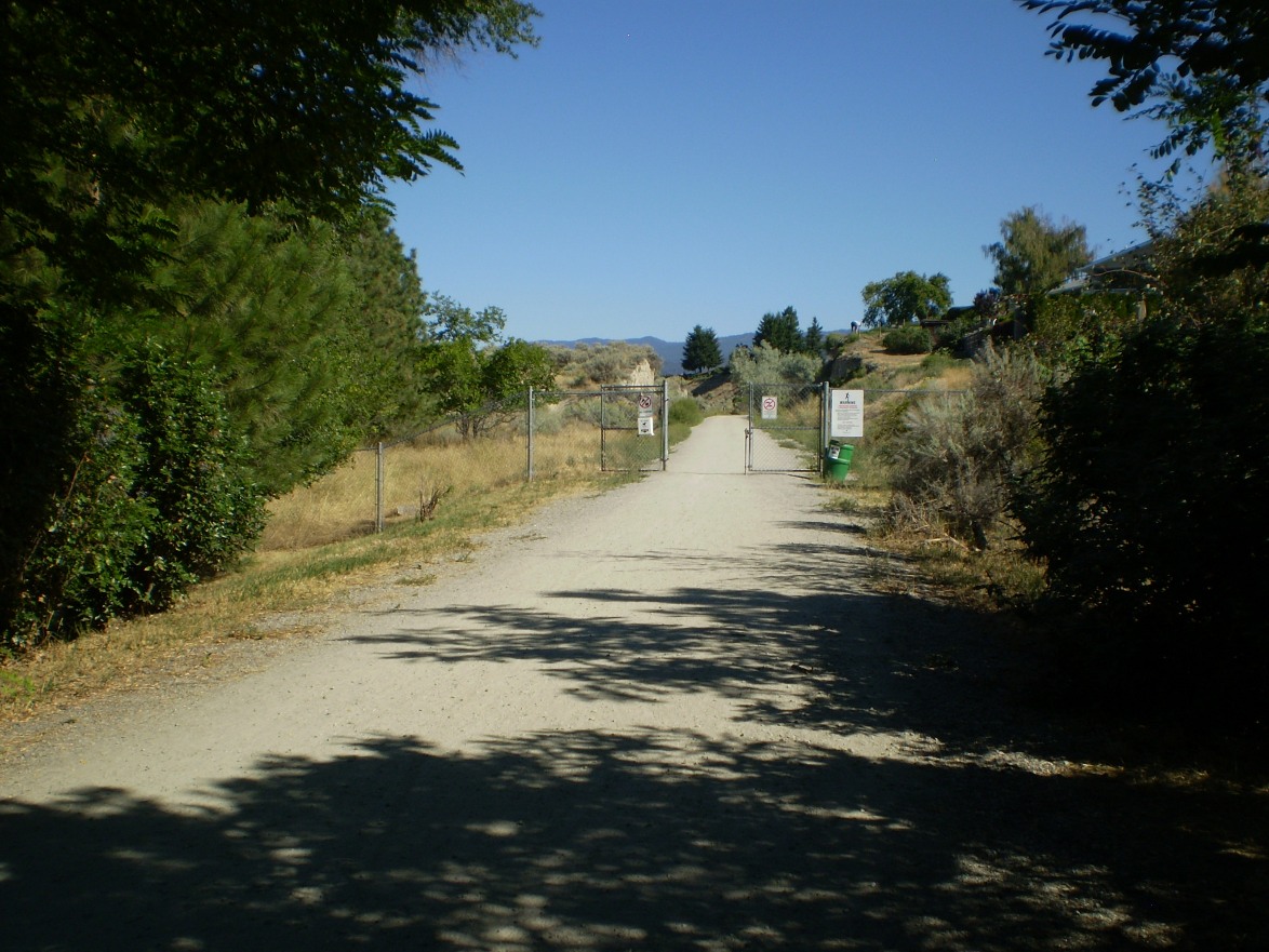 Directions: In Penticton turn into Vancouver PL from Vancouver Avenue. The trail head is found on the east side near the end of the Vancouver PL cul de sac. See the photographs below. Note: Though they are rarely seen April to October is rattle snake season. The end point of this section of the KVR is roughly 10.3 KM (6.4 miles) north at the parking lot off Smethurst Road above Naramata. The trail follows the KVR rail bed along the east side of Okanagan Lake and provides very scenic views. It starts out passing by the steep cliffs left over from the edge of the huge lake that formed from the Ice Age glaciers. This lake stretched from McIntyre Bluff to Enderby. The trail passes through vine yards, orchards, across a wooden bridge, past the Trail Store and crosses Naramata Road. At Naramata Road and Poplar Grove Road there is another parking area for accessing the trail. Once across Naramata Road the trail is a steady 2.3% climb. A short distance after Naramata Road there is a winery and bistro which can be accessed from the trail. From the parking lot above Naramata at Smethurst Road Rock Oven 7 is about 3.3 KM (2.1 miles) north. Little Tunnel is about 3.8 KM (2.4 miles) north. See Kettle Valley Railway Naramata to Glen Fir. The ride back to Penticton is easy as one can coast at a good speed most of the time.