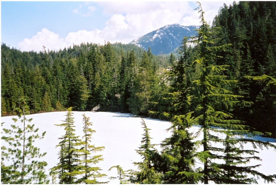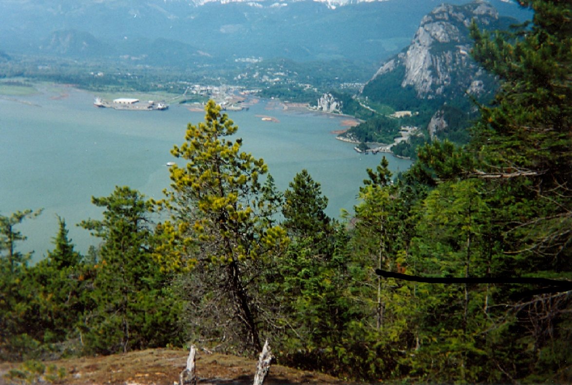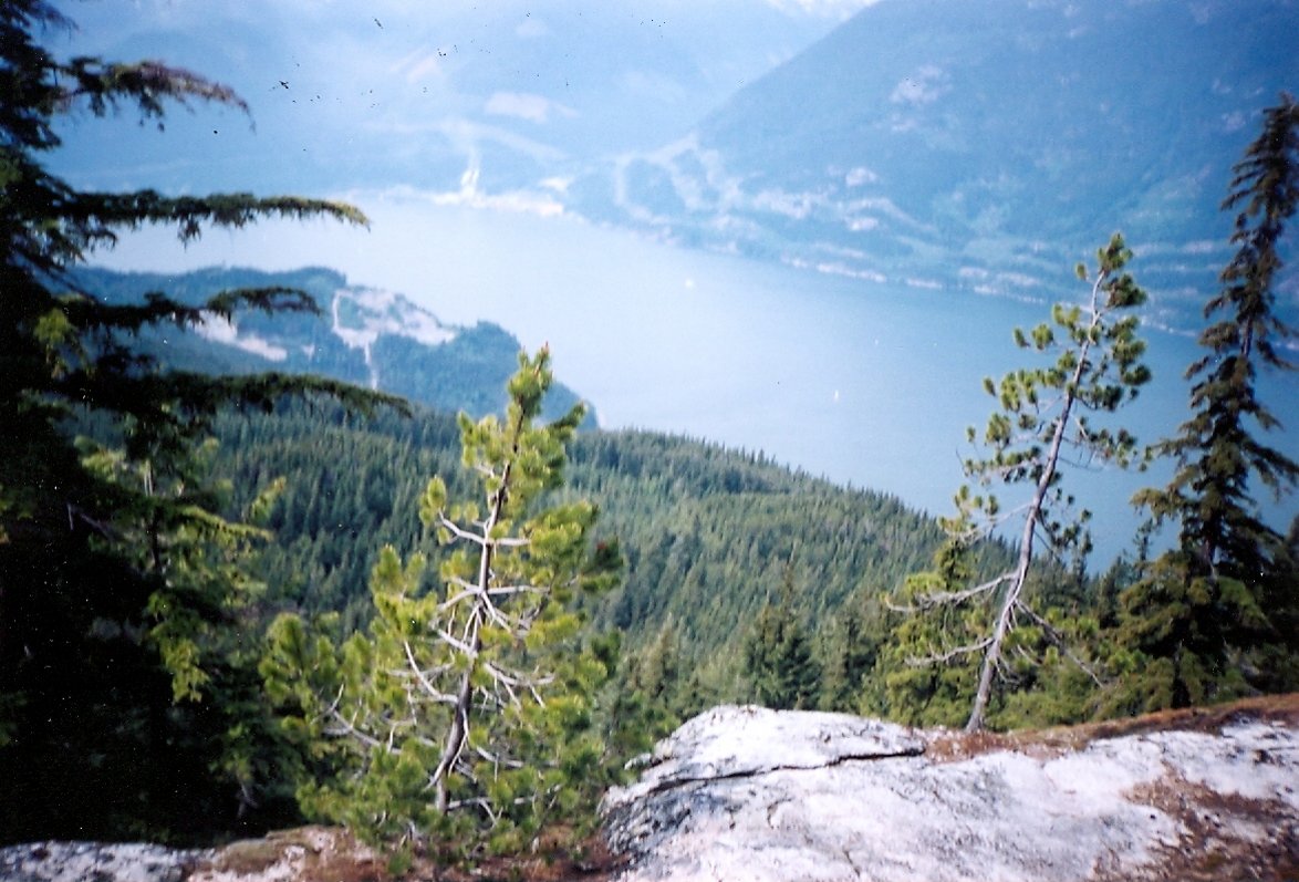 Directions: From Vancouver drive north on highway 99. Approximately 3 KM (1.9 miles) north of Britannia turn left (west) into the parking lot for Murrin Provincial Park. The sign post for the trail is found a short distance north of the parking lot on the east side of the highway. The start of the trail involves a steep climb up the bluff beside the highway. The trail heads into the forest but along the way provides several very scenic viewpoints of Howe Sound. A fork will eventually be encountered with a sign on the right fork saying Goad Ridge. Do not take the right fork, keep going straight ahead. Another fork will come up with the sign for the right fork sign saying "Lake Circuit". Continue straight ahead which will take one to a rock ledge overlooking Petgill Lake. Petgill Lake is a very scenic little lake. The photos below from 1998, 2001 and 2004 show the lake and some of the viewpoints.